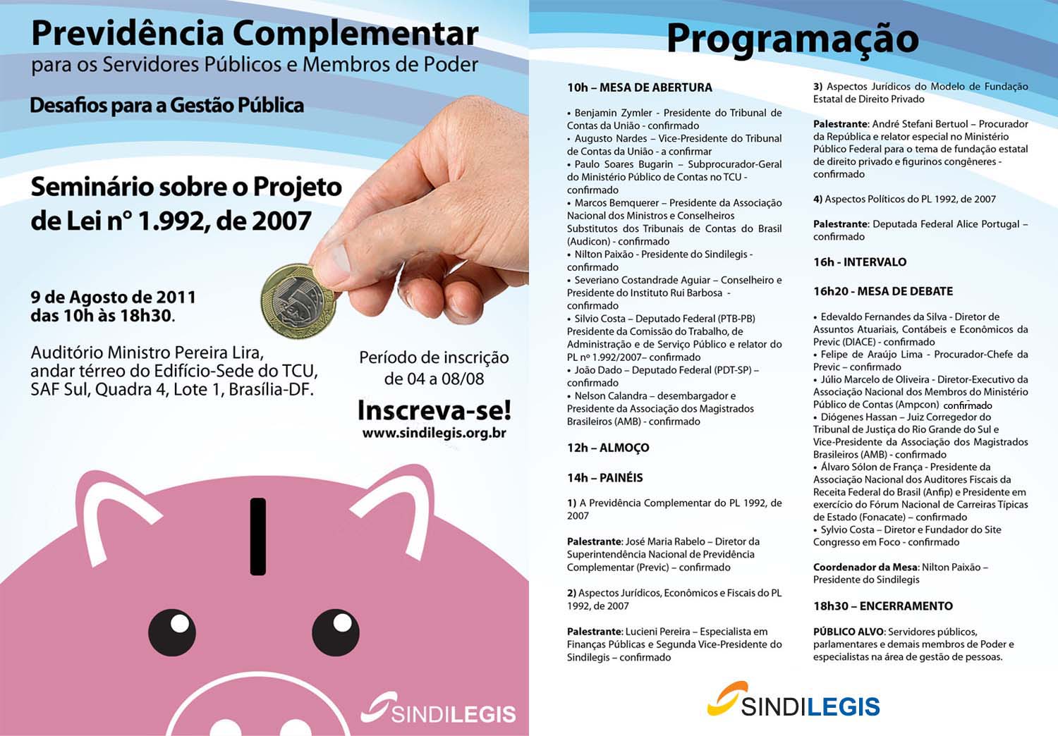 O Sindicato dos servidores do Poder Legislativo e Tribunal de Contas da Uniião - Sindilegis realizará no próximo dia 9 de agosto o Seminário “Previdência Complementar para os servidores públicos e membros de Poder – Desafios para a Gestão Pública”, para discutir o Projeto de Lei 1.992/07, que institui a previdência complementar para o servidor público. As inscrições estão abertas a partir desta quinta-feira (4) e os interessados podem se inscrever no site: www.sindilegis.org.br.