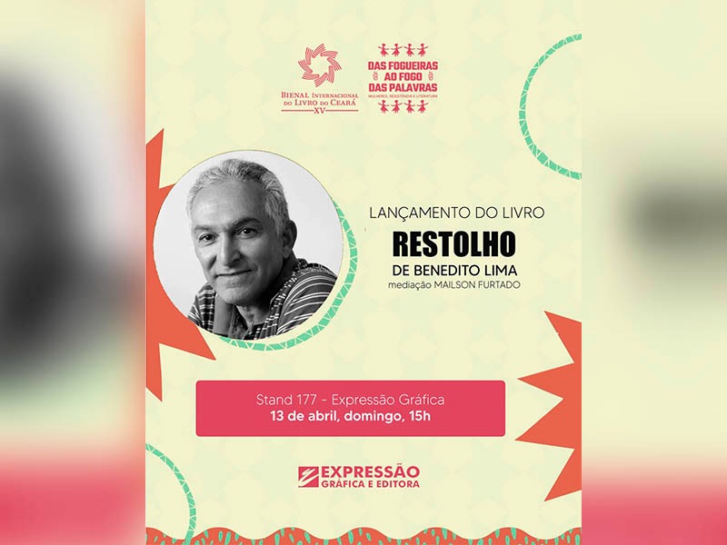 No próximo dia 13 de abril, domingo, às 15h, no Stand 177 – Expressão Gráfica -, na Bienal Internacional do Livro no Ceará, o Auditor Fiscal do Trabalho Benedito Lima lança a obra Restolho, da Edições Criar, no Centro de Eventos do Ceará, em Fortaleza. Na ocasião, haverá mesa redonda com o autor Benedito Lima sob a mediação do também escritor Mailson Furtado.